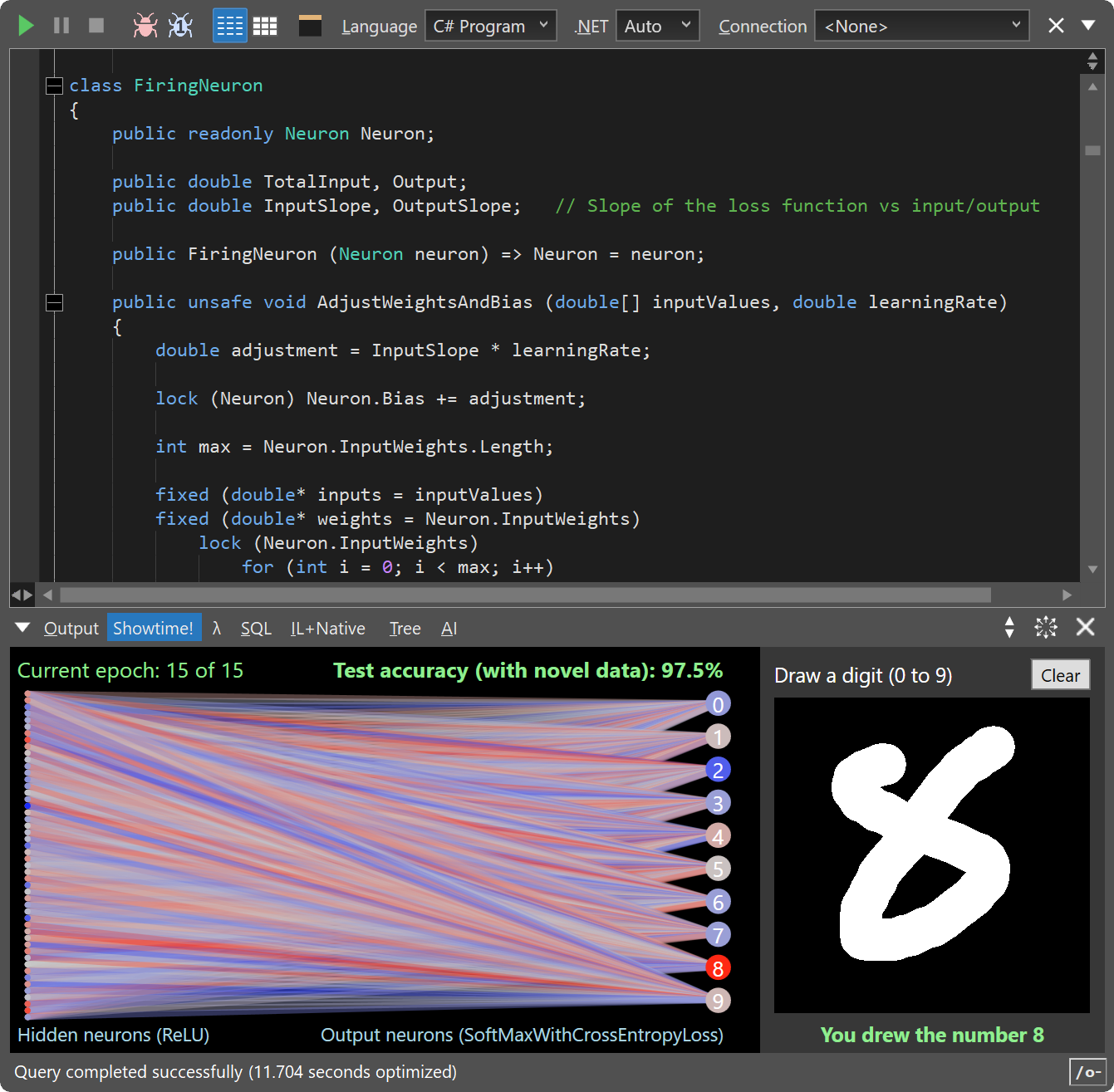 您可以在LINQPad中使用 LINQ(以及SQL)这种现代查询语言对数据库进行交互式查询。