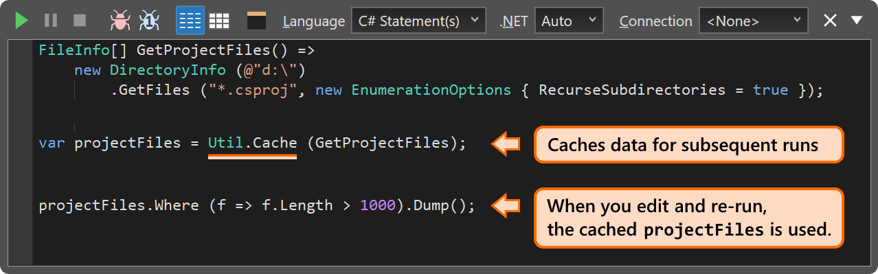 在 LINQPad 中,您可以使用 Util.Cache 缓存中间数据。编辑并重新运行您的查询,而无需重新计算以前的结果。